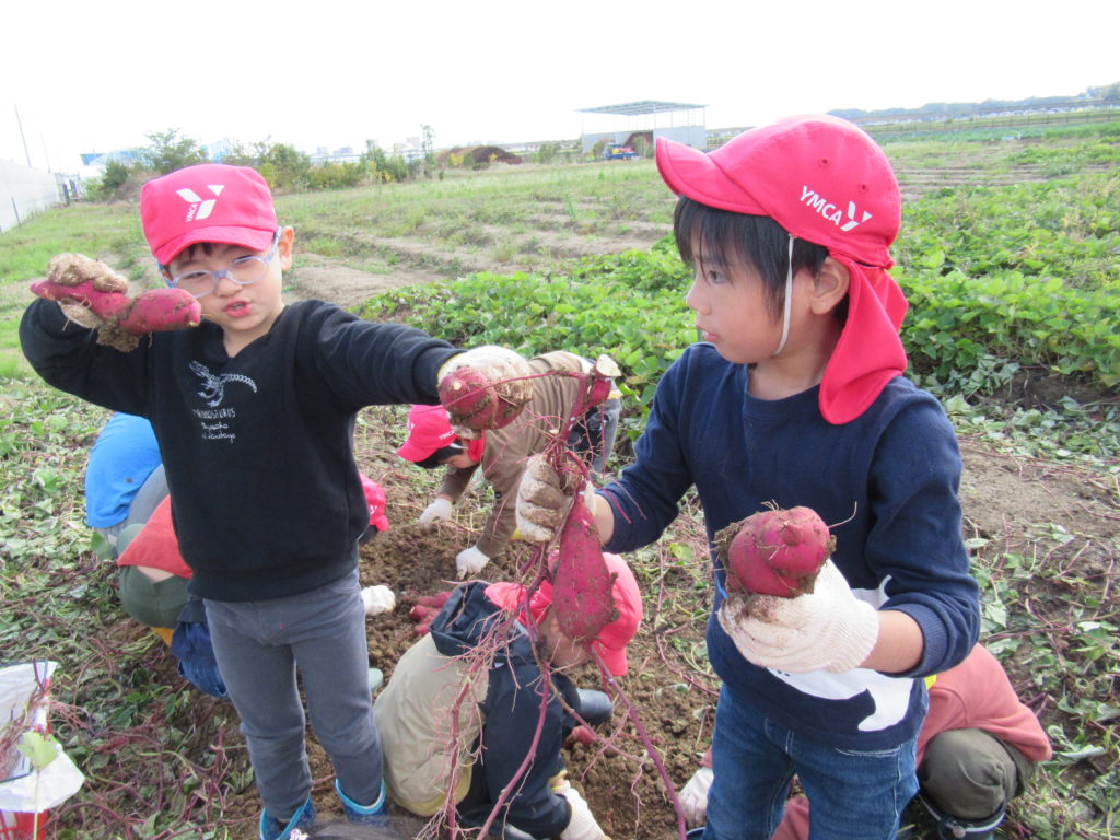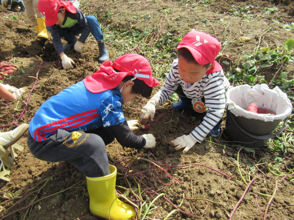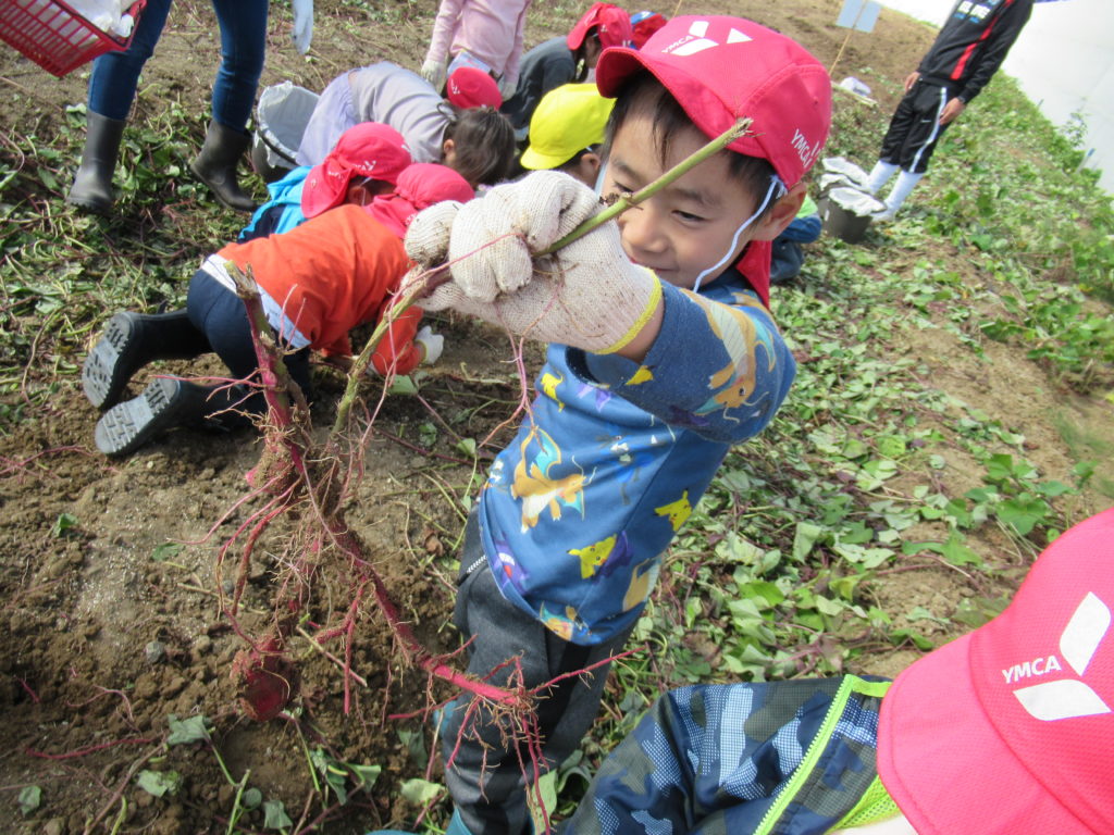 固い土を掘って掘って…お芋が顔を出すと大興奮!お芋が折れないように慎重に周りの土を掘っていきます。最後土から抜けると大喜び。みんなとっておきの笑顔を見せてくれました。