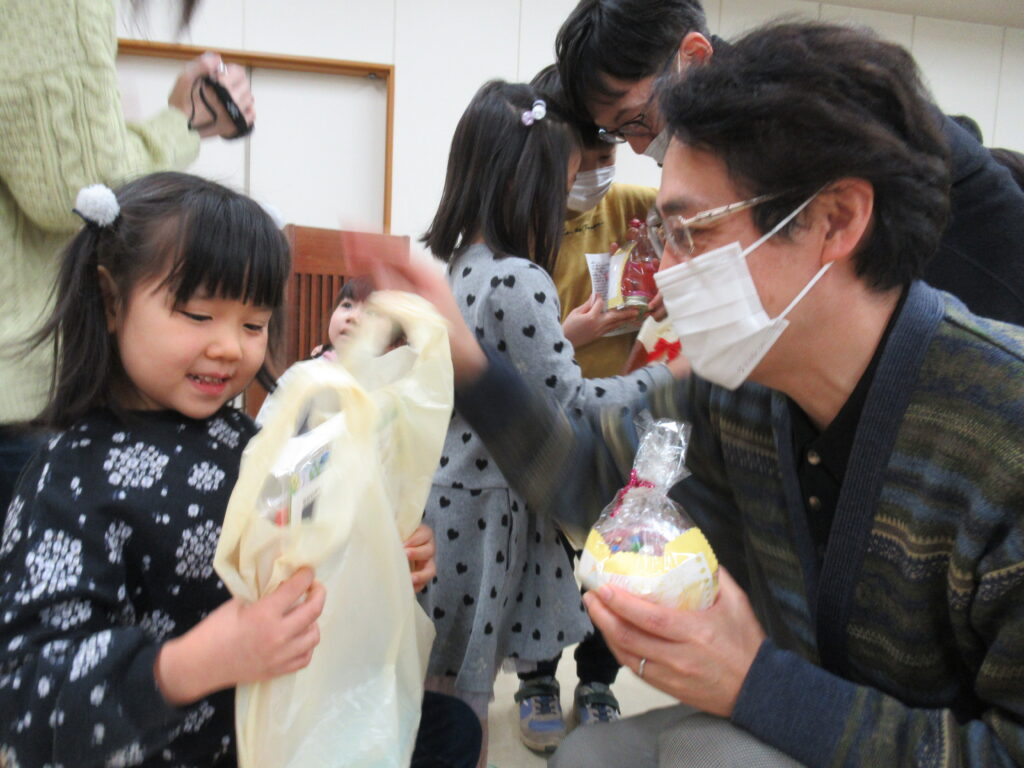 「明日から幼稚園はおやすみです。今日は帰る時に、”よいお年を~”って挨拶してみてね。楽しいお正月を過ごしてね。」と伝えると、少し照れながら教師や友だちに挨拶する姿がありました。