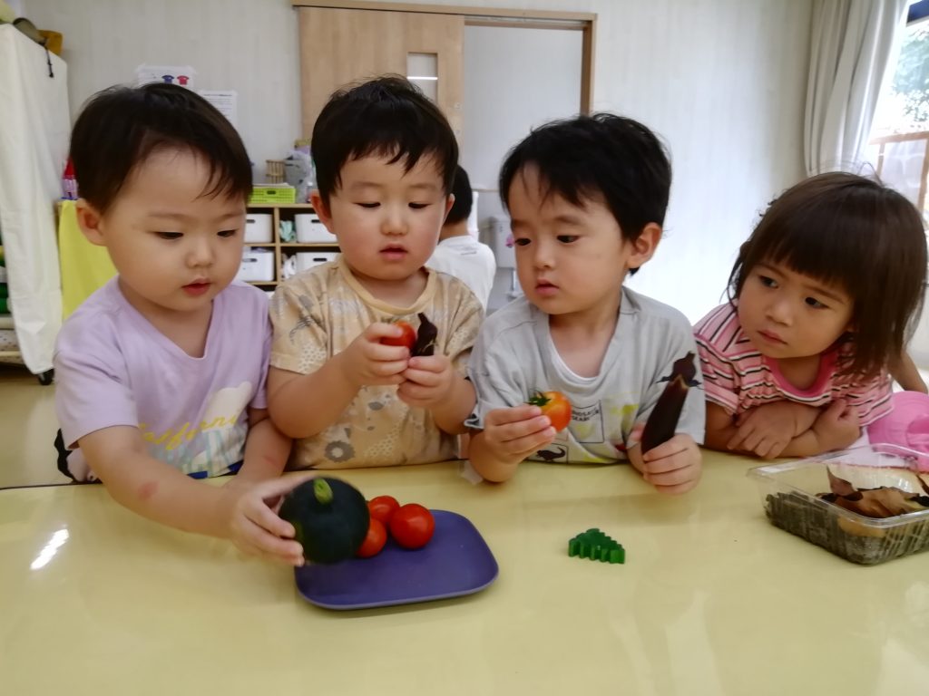 幼稚園で育てている野菜がたくさん実り、収穫しました。
