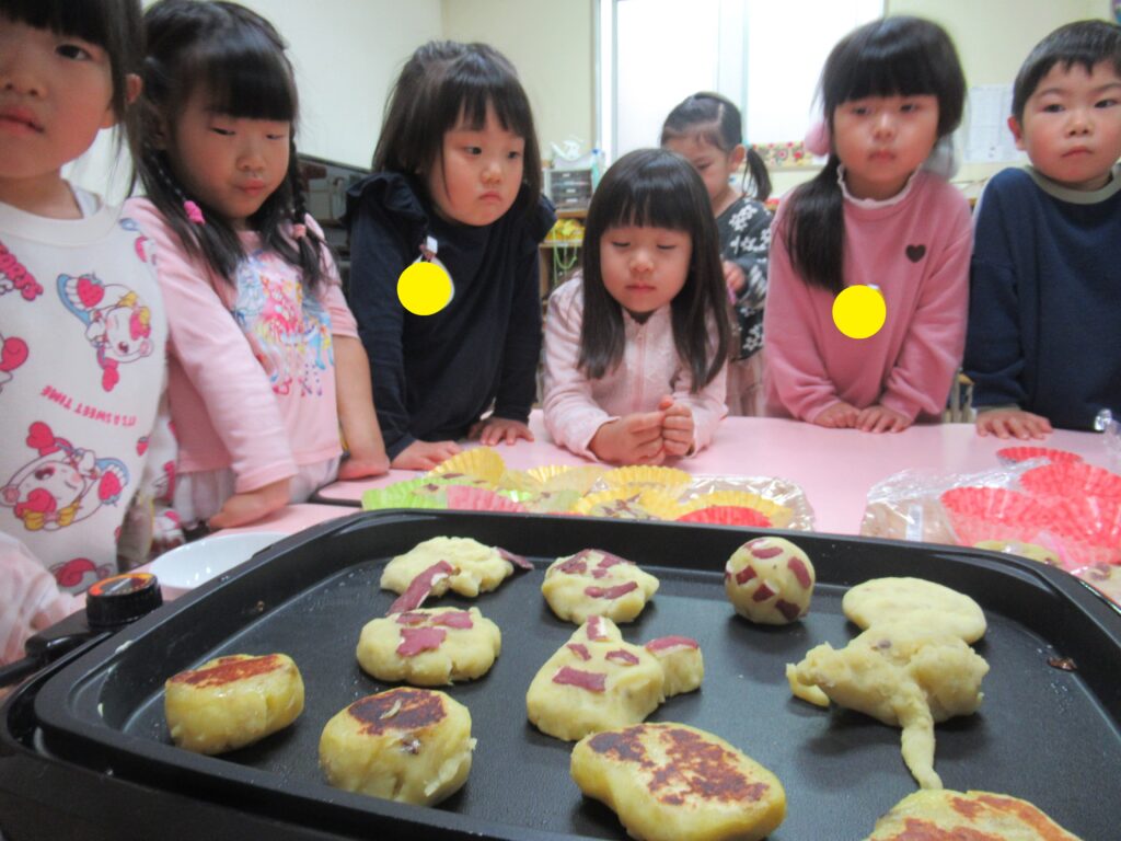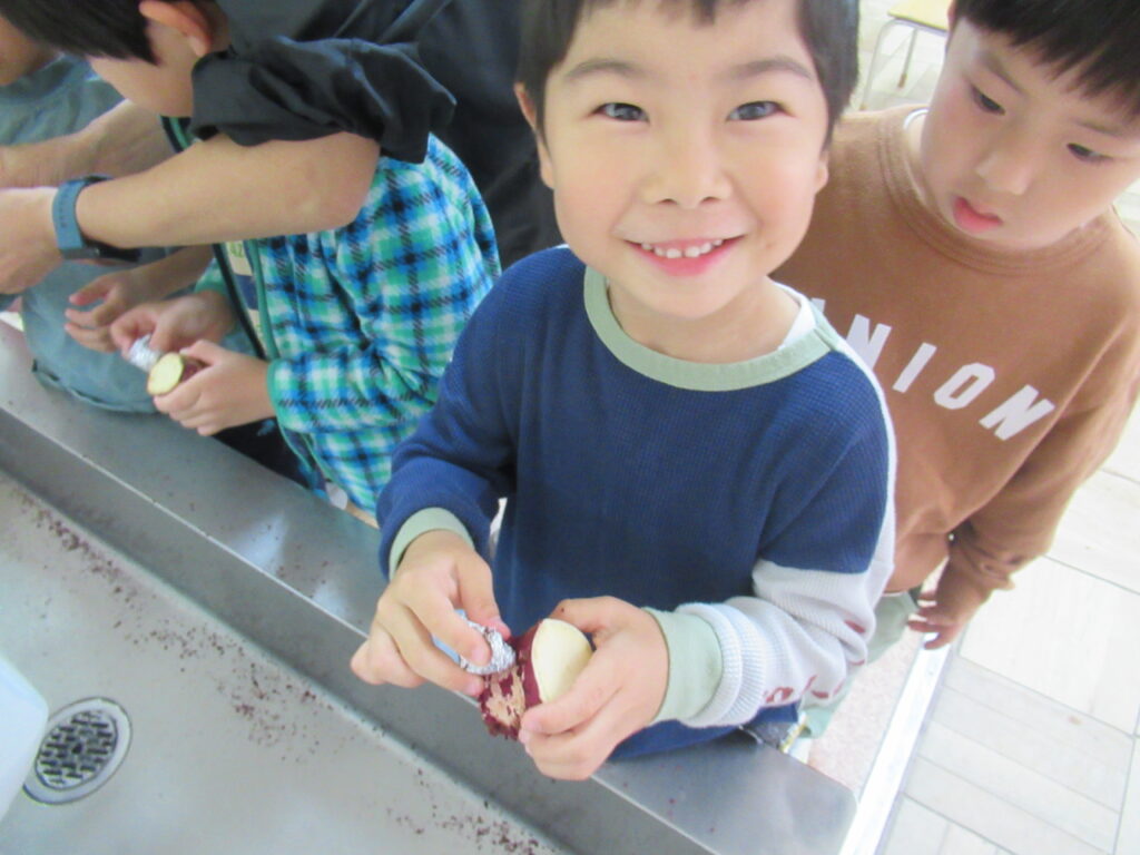 さつまいもの皮を使ってかざりつけもして、個性豊かでおいしいさつまいももちが出来ました。焼いて食べたのが食後にもかかわらず、ほとんどのお友だちが完食!おいしさが伝わってきます。
