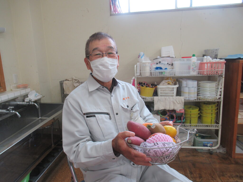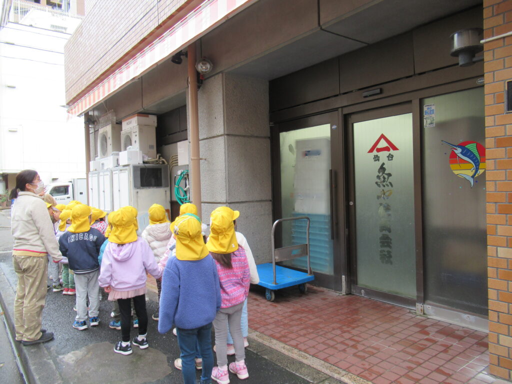 年中児ひまわり組では、近所の魚屋さん「ヤマイチさん」へ秋の恵みを届けに行ってきました。