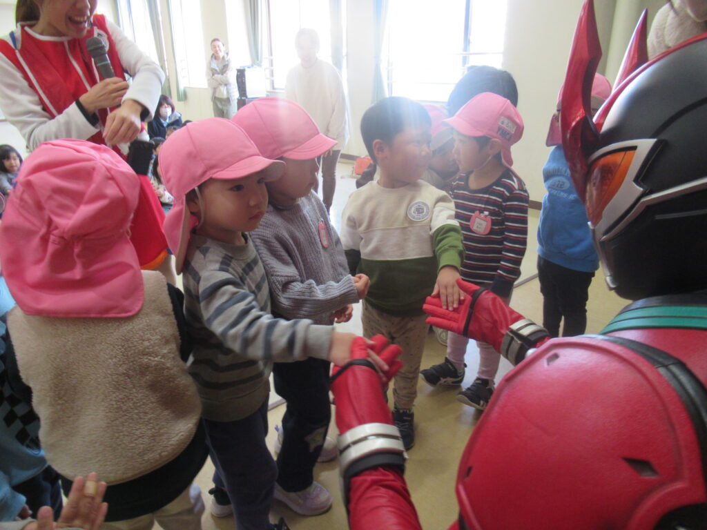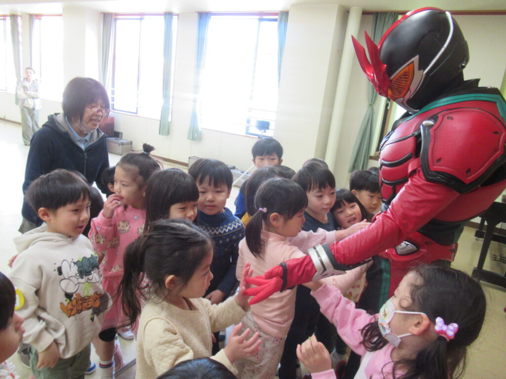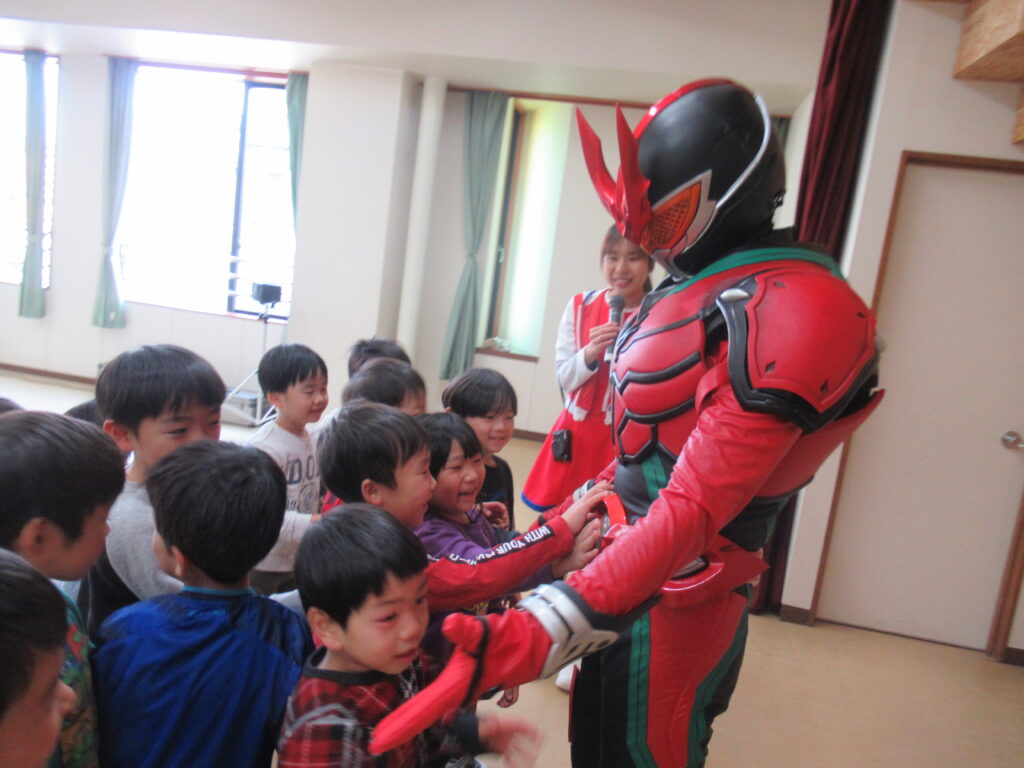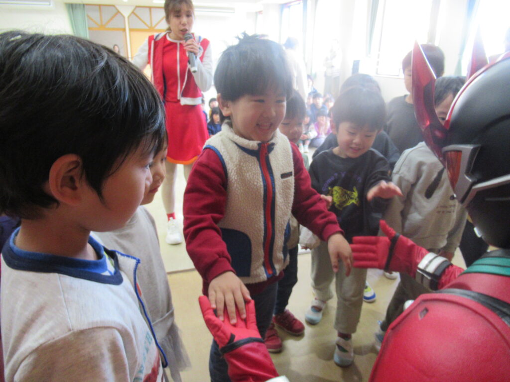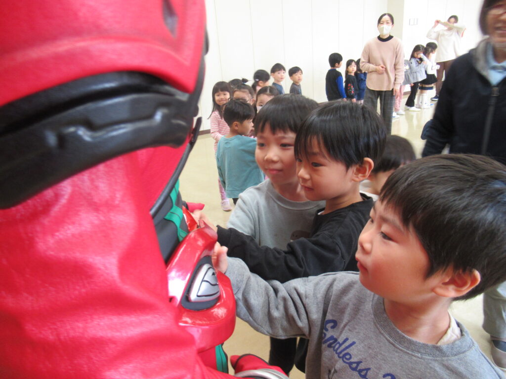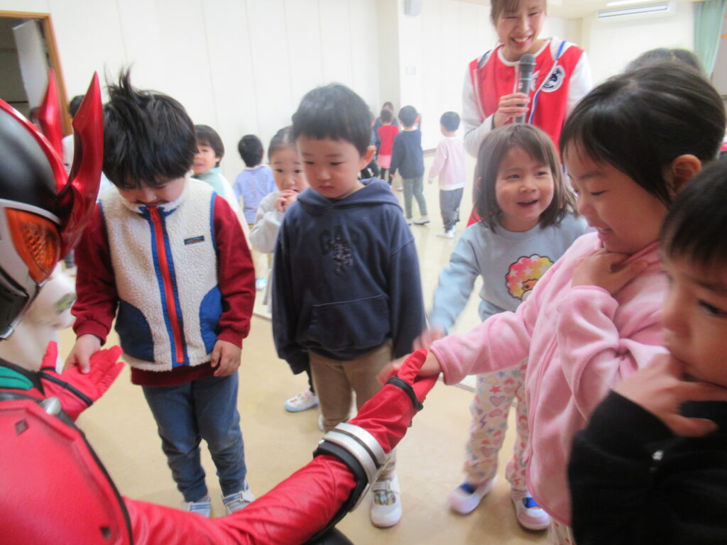 緊張してなかなか近づけない子にも、龍は優しく手を差し伸べてくれました。優しくてかっこいいヒーローでした…!!ハイタッチや握手をしてふれあいを楽しみました。ベルトに触っていいよと、とっても優しい龍にドキドキしながらも触れていました。
