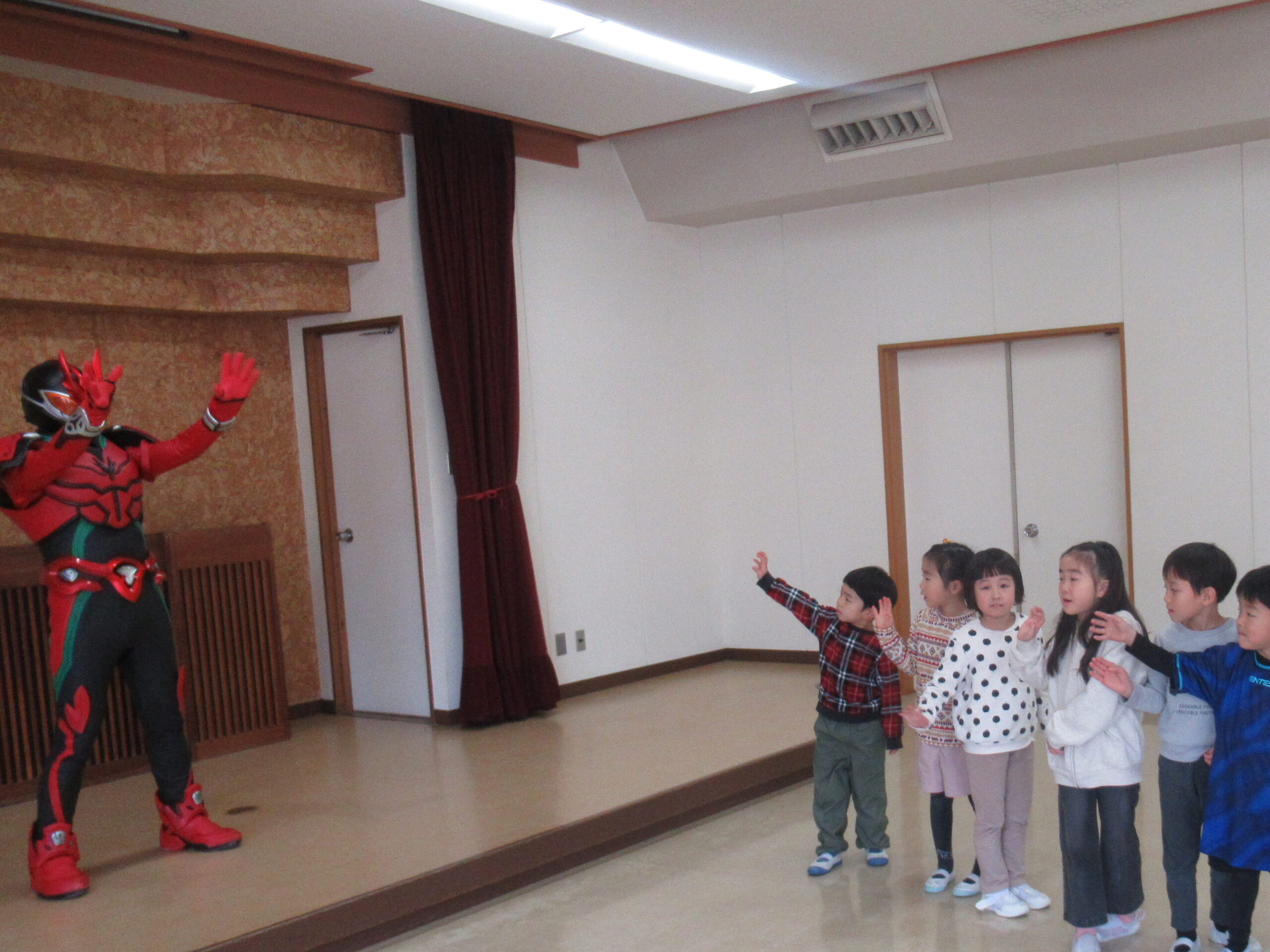 PTA主催イベントが行われました。「破牙神ライザー龍」という、宮城県のオリジナルヒーローが来てくれました。PTA主催イベントのポスターが幼稚園に貼りだされてから、「ヒーローが来るよ」とずっとずっと楽しみにしていた子どもたち。